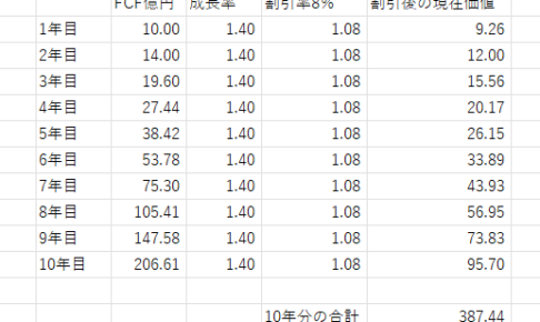実在するA社を例にして計算していきます。 1年目のFCFが10憶円 年間平均成長率が40% 割引率(市場平均リ…