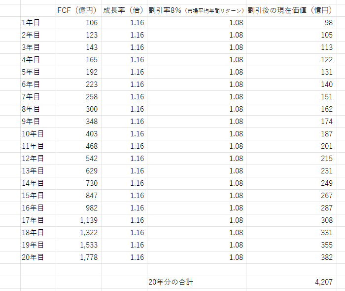 割引キャッシュフロー法を使って、この会社の価値を計算すると4207憶円と求まりました。