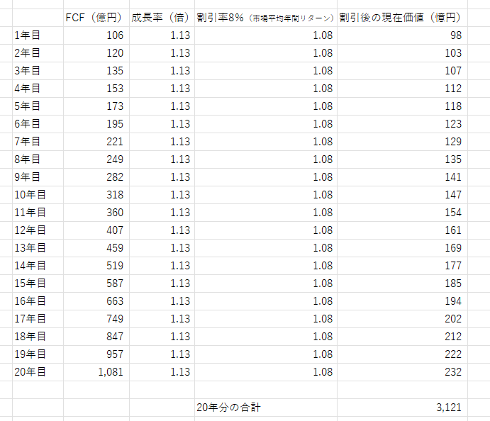 割引キャッシュフロー法を使って、この会社の価値を計算すると3121憶円と求まりました。