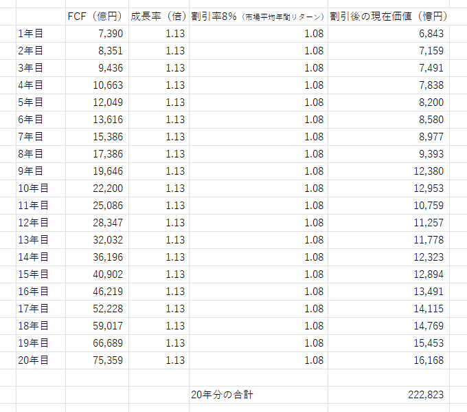 20年安定成長が見込めるため、割引後の20年分のFCFを求めて合計します。